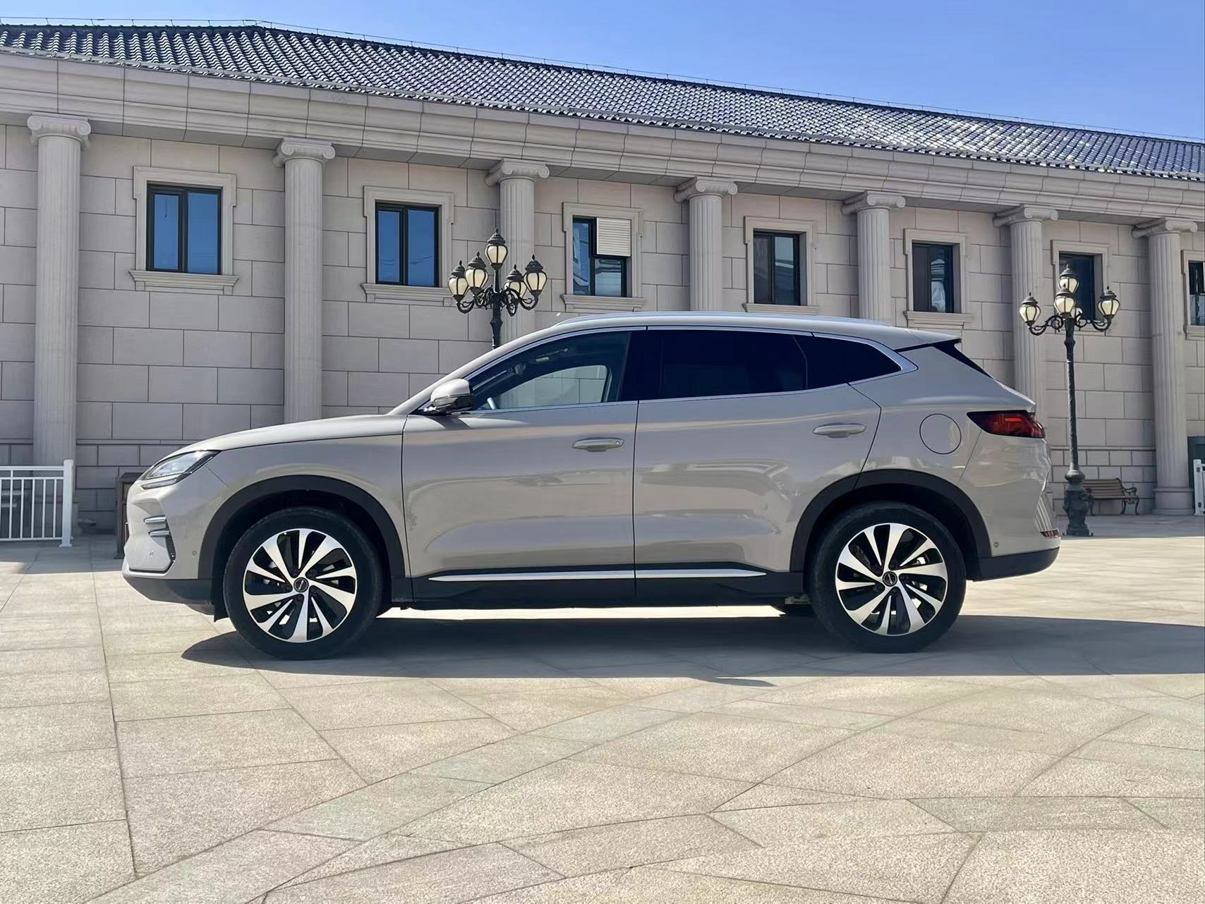 来到车侧,可以看到宋PLUS EV荣耀版车型腰线平直,从前大灯组延伸至车尾,很好的营造出简洁流畅的视觉效果。车身尺寸方面,新车长宽高分别为4785/1890/1660毫米,轴距为2765毫米。