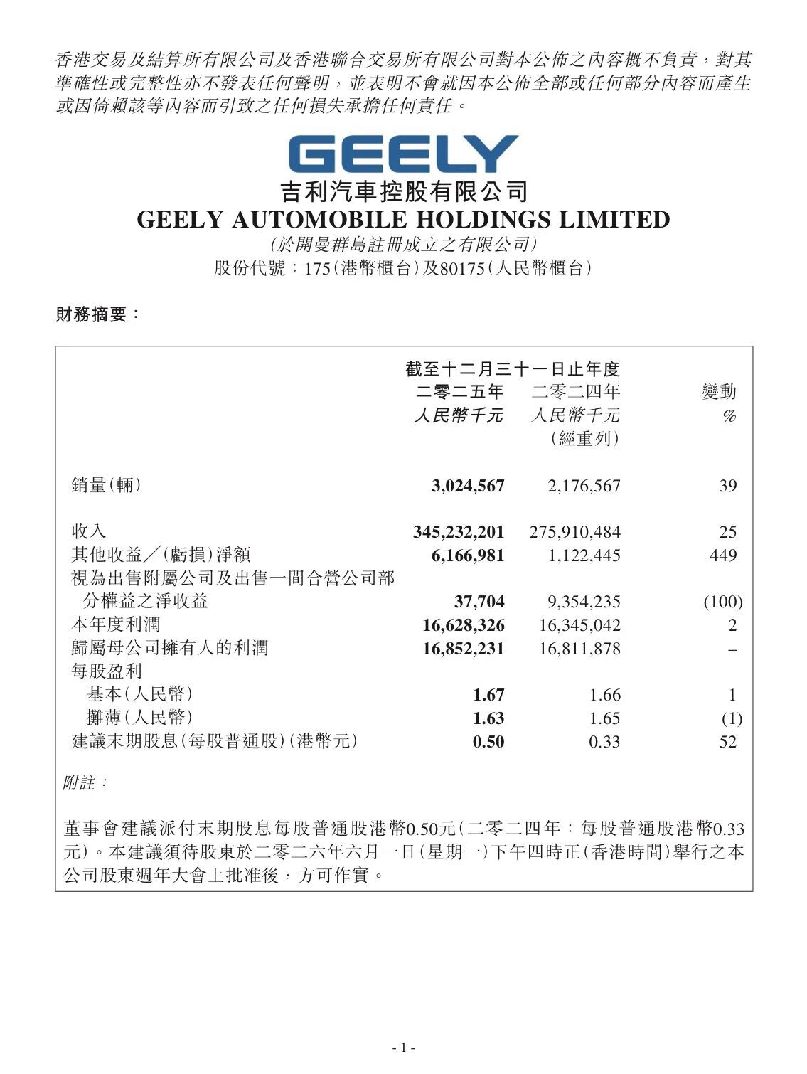 买车网Buycar获悉,3月18日,吉利汽车控股有限公司(0175.HK)发布公告称,2025年吉利汽车总收入3452亿元,同比增长25%,创历史新高;实现核心归母净利润144.1亿元,同比增长36%,核心利润增速高于收入增速,实现高质量增长。